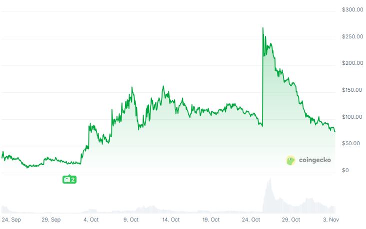行情数据显示,GIGGLE 在上线币安现货当日价格一度突破 270 美元(币安价格高点甚至突破 310 美元)后持续下跌,暂报 75 美元,市值 7700 万美元。
