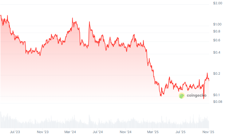 行情数据显示,Open Campus 为“远古项目”,其代币 EDU 价格曾在 2023 年 4 月底创下历史高点 1.67 美元,并于今年 10 月 10 日触及历史低点 0.071 美元。目前报价 0.166 美元,流通市值约为 1 亿美元。