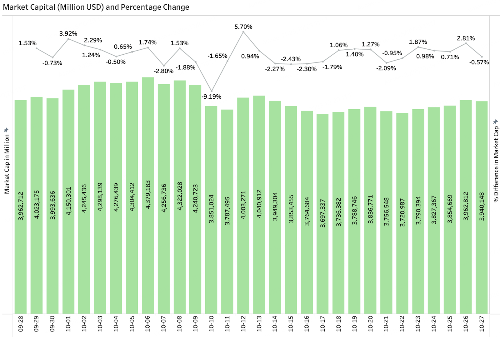 据 CoinGecko 数据,截至10月27日,加密货币总市值为3.94万亿美元,较上月下滑0.57%,月初至10月9日期间加密总市值持续小幅上升,从3.96万亿美元增至4.32万亿美元,反映出资金在阶段性利好下逐步回流。但10月10日至11日市场突发下行,市值日降幅超9%,为全月最大回撤,显示在“10·11”行情中资金出现恐慌性出逃。此后市场虽短暂反弹,最高回升约5.7%,但整体反弹力度有限,市值维持在3.7万亿至3.9万亿美元区间震荡。整体来看,市场在经历剧烈调整后趋于平稳,资金观望情绪增强,增量资金入场意愿不足,仍处于震荡阶段。