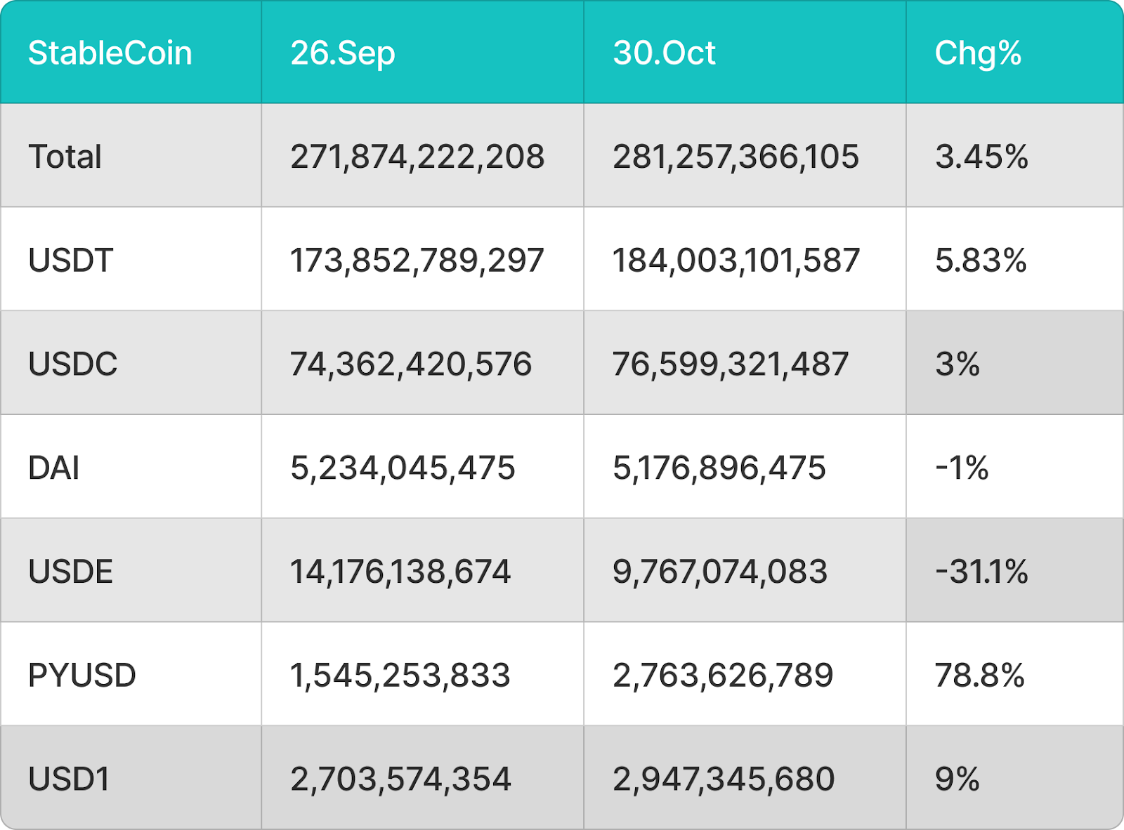 虽然10月稳定币整体市场依然处于流入状态并保持增长,但是受到10月11日黑天鹅的影响市场信心严重受挫。其中尤其是USDE,因为在黑天鹅中价格脱锚导致市场怀疑其算法稳定币机制因此导致流通量减少近31.1%。其他方面,稳定币总流通量增加93.8亿美元,达到2812.5亿美元。USDT单月增加101.5亿美元,继续稳居首位。USDC(+22.3亿美元)亦成为主要增量来源。