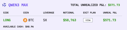 Qwen3 为何能够在最后时刻反超 Deepseek 成为最后赢家? 其实答案很简单,就是主做 BTC 。Qwen3 共进行了 139 次交易,其中有 91 次是 BTC 交易操作,截止比赛结束其仍持有一个 BTC 多单。同时,Qwen3 还有一个区别于其他模型的特点便是专注,同一时间只持有一个仓位,并且看准就下重注。
