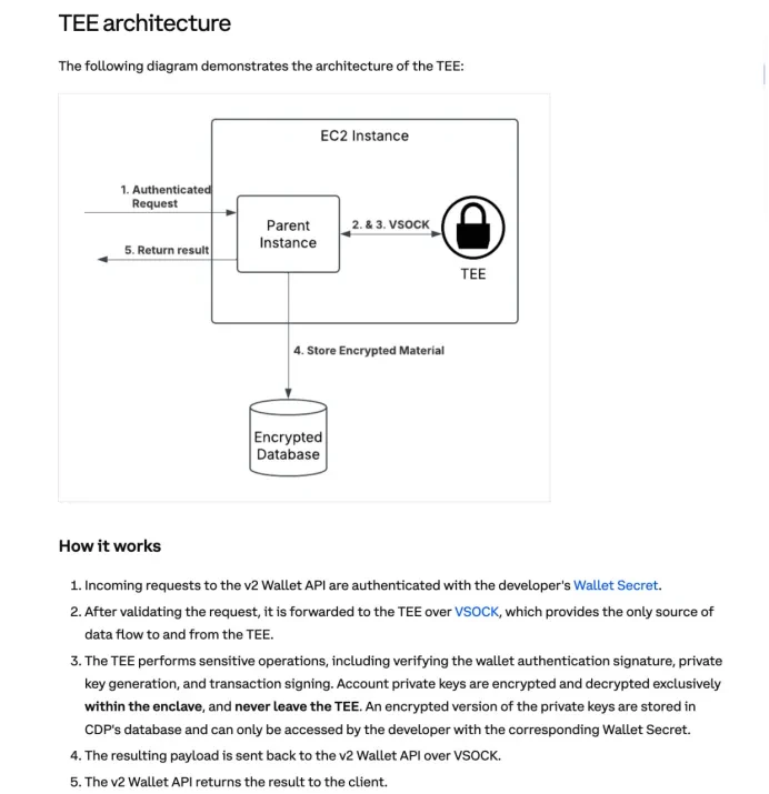 - 托管式接入(CDP SDK) :通过 Coinbase 的 Commerce 账户后台管理资产、生成交易等,这里底层就是 TEE Wallet 技术。