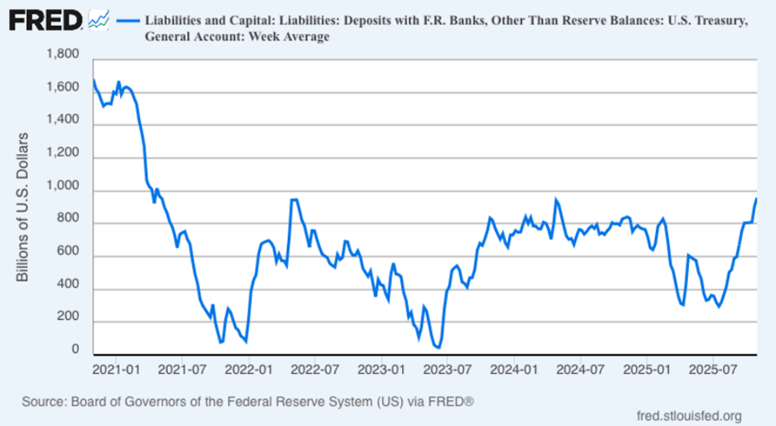 当国会预算僵局迫近、关门风险上升时,财政部会提前发债筹资、拉高TGA 余额,确保政府停摆期间仍有现金支付必需支出。