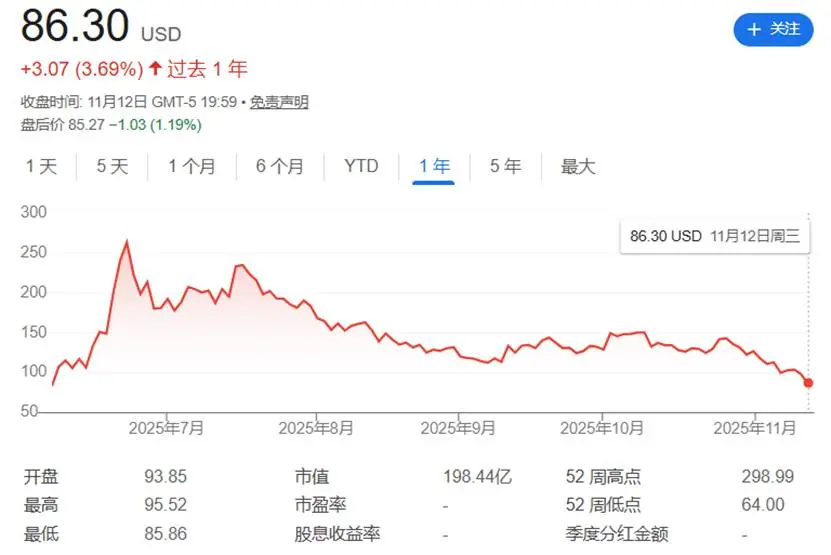 2025 6 月以 31 美元定价完成 IPO 以来, Circle 股价经历大幅波动,从高点 298.99 美元回落至当前 86.3 美元,总市值已缩水超 70%