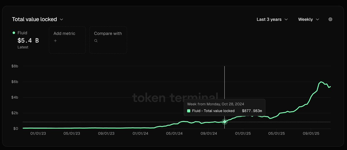 自一年前 Fluid DEX 上线以来,Fluid 的 TVL(总锁仓量)增长了 515%。