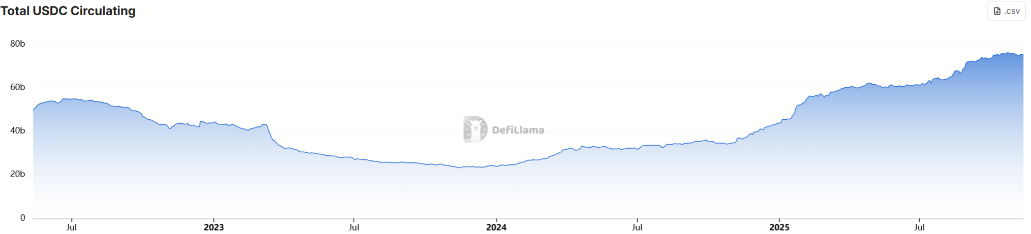Circle Internet Group 发布的第三季度 财务报告 显示,公司营收同比增长 66%,达到约 7.4 亿美元,净利润大幅提升。这一强劲表现得益于 USDC 流通量的激增——截至报告期末,USDC 市值已超过 750 亿美元,位居全球第二大稳定币,仅次于 Tether 的 USDT。