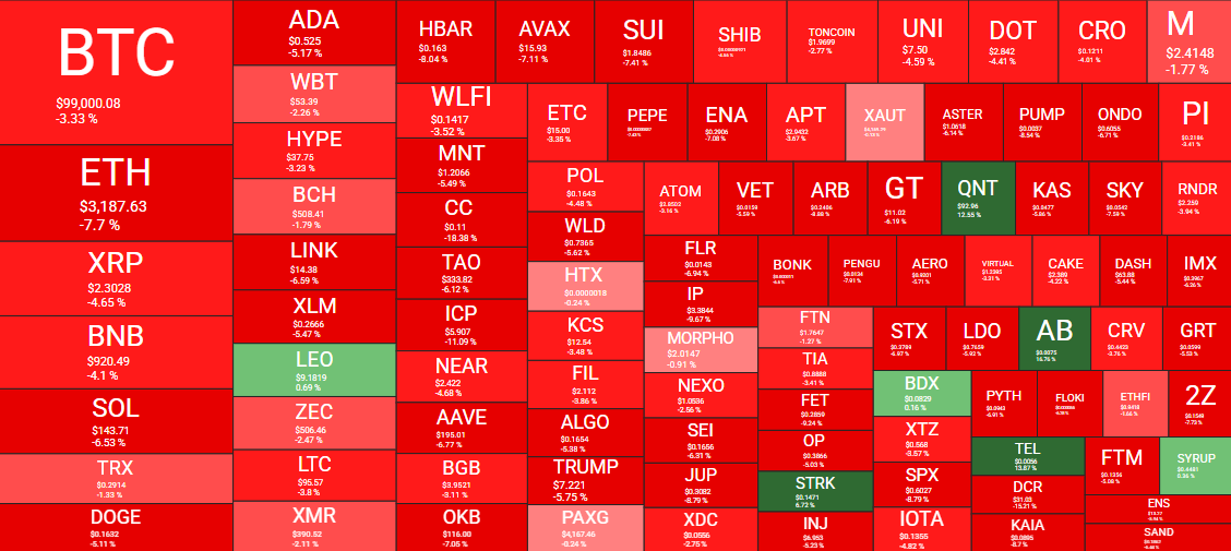 BTCETH、SOL、BNB 外,山寨币市场依旧持续下跌, 据 Quantifycrypto 数据 ,市值前 100 的加密货币超 90% 在过去 24H 处于下跌状态。