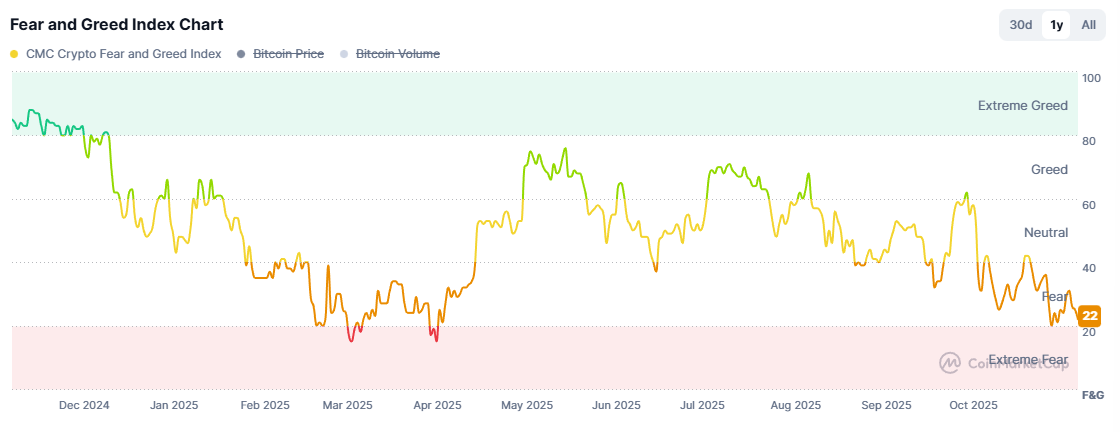 根据 CoinMarketCap 数据 ,恐慌与贪婪指数持续走低,超过一周时间处于“极度恐慌”状态,市场情绪跌至冰点。