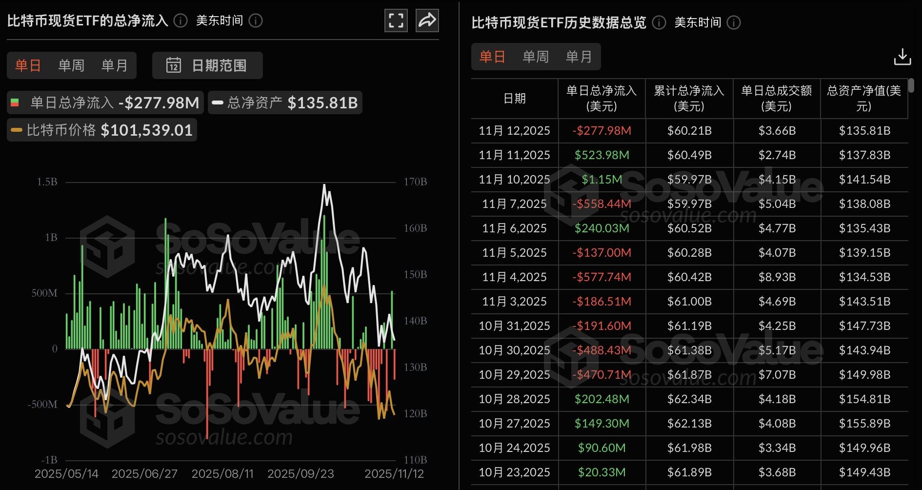 现货 ETF 数据是观测市场资金的重要指标。 根据 SoSoValue 数据, 自 10 月 29 日起,BTC 现货 ETF 多次出现大额净流出。其中,11 月 4 日单日净流出高达 5.77 亿美元。尽管在 11 月 6 日和 11 月 11 日短暂录得净流入(11 月 10 日净流入 115 万美元,暂忽略),但整体来看,11 月以来资金仍然延续净流出态势。