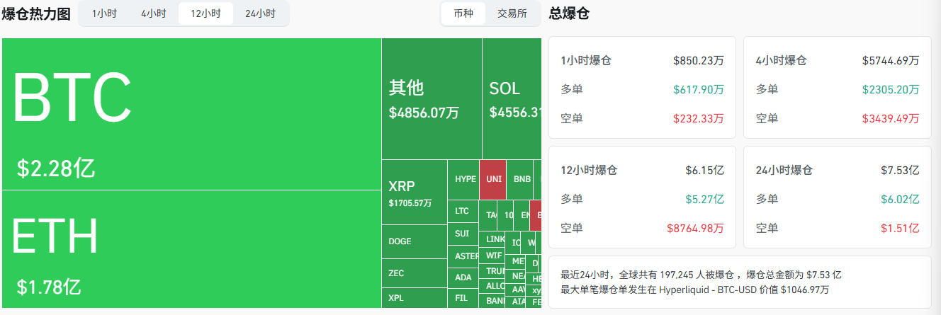 衍生品市场方面, 据 Coinglass 数据 ,过去 12 小时内全网爆仓金额高达 6.15 亿美元,其中多单爆仓 5.27 亿美元,BTCETH爆仓重灾区,金额分别为 2.28 亿美元和 1.78 亿美元。