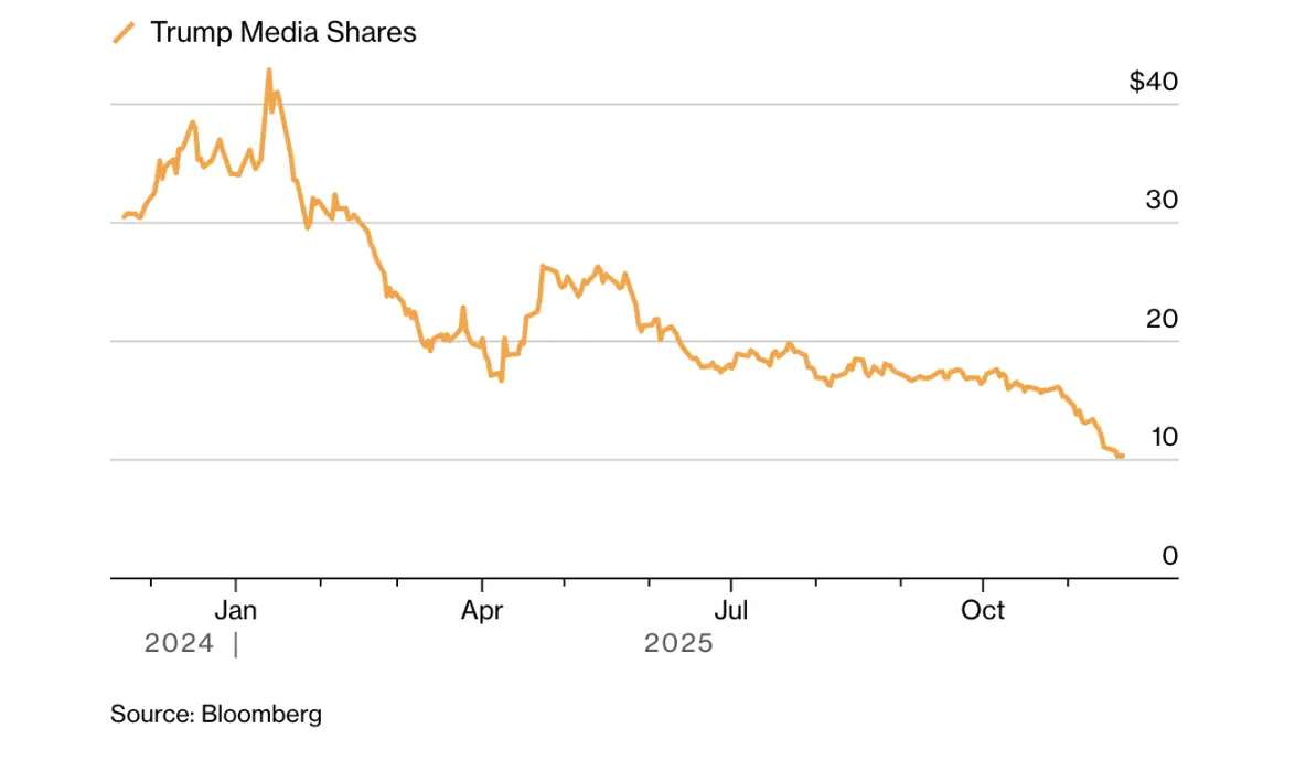 自 8 月以来,一款以特朗普命名的 memecoin TRUMP 价值下跌约四分之一;埃里克・特朗普(特朗普总统次子)在某比特币矿业企业的持股较峰值缩水近半;而今年开始囤积比特币的特朗普媒体科技集团,股价已跌至历史低位附近。