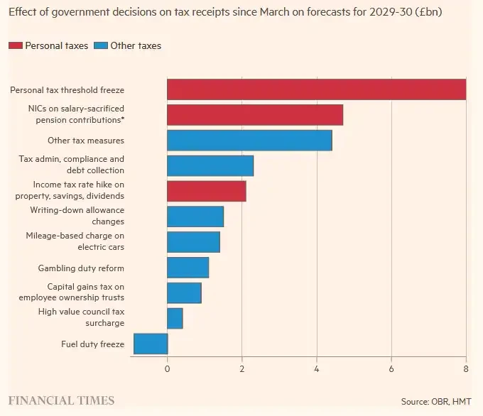 预算案里最引人注目的,是延长个人所得税起征点冻结时间。这个看似不起眼的技术操作,会在 2030-31 财年为财政部贡献 127 亿英镑。根据 Office for Budget Responsibility 的预测,在预算周期末,英国将有四分之一的劳动者被推入 40% 的较高税率档。这意味着,哪怕工党议员为房东税、股息税的上调拍手叫好,真正持续承压的,却依然是最普通的工薪阶层。
