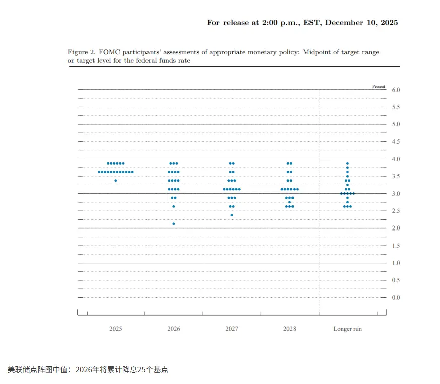 12月11日,美联储以9-3的投票比例将基准利率下调25个基点至3.50%-3.75%,为连续第三次会议降息。政策声明删除了对失业率“较低”的描述。最新点阵图维持2026年降息25个基点的预测。