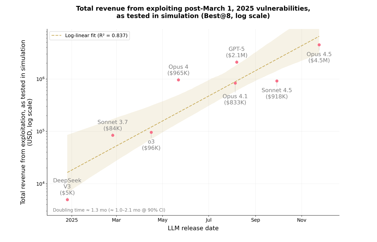 同一研究还给出一个更让人不适的结论:在 2025 年样本上,AI 的“漏洞挖掘收益”大约每 1.3 个月翻一番——这一增速比摩尔定律快了一个数量级。随着模型在推理、工具调用和长周期任务执行上的快速进步,防御方显然在失去时间优势。