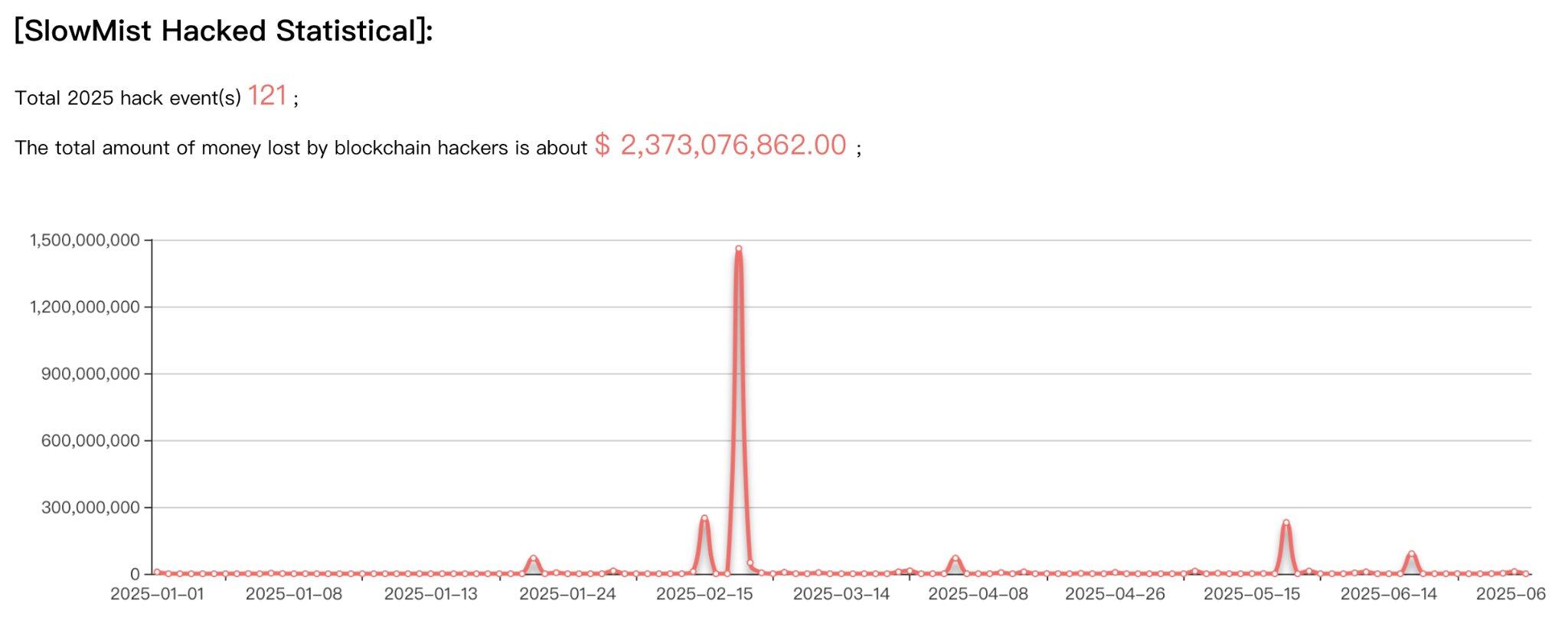今年的加密攻击呈现出一种新的对称性:事件数量减少,但每次攻击的破坏性却显著增强。SlowMist发布的2025 年中报告显示,上半年加密行业遭遇了 121 起安全事件——比去年同期的 223 起下降了 45%。这本应是好消息,但攻击事件损失却从 14.3 亿美元飙升至 约23.7 亿美元,增幅 66%。