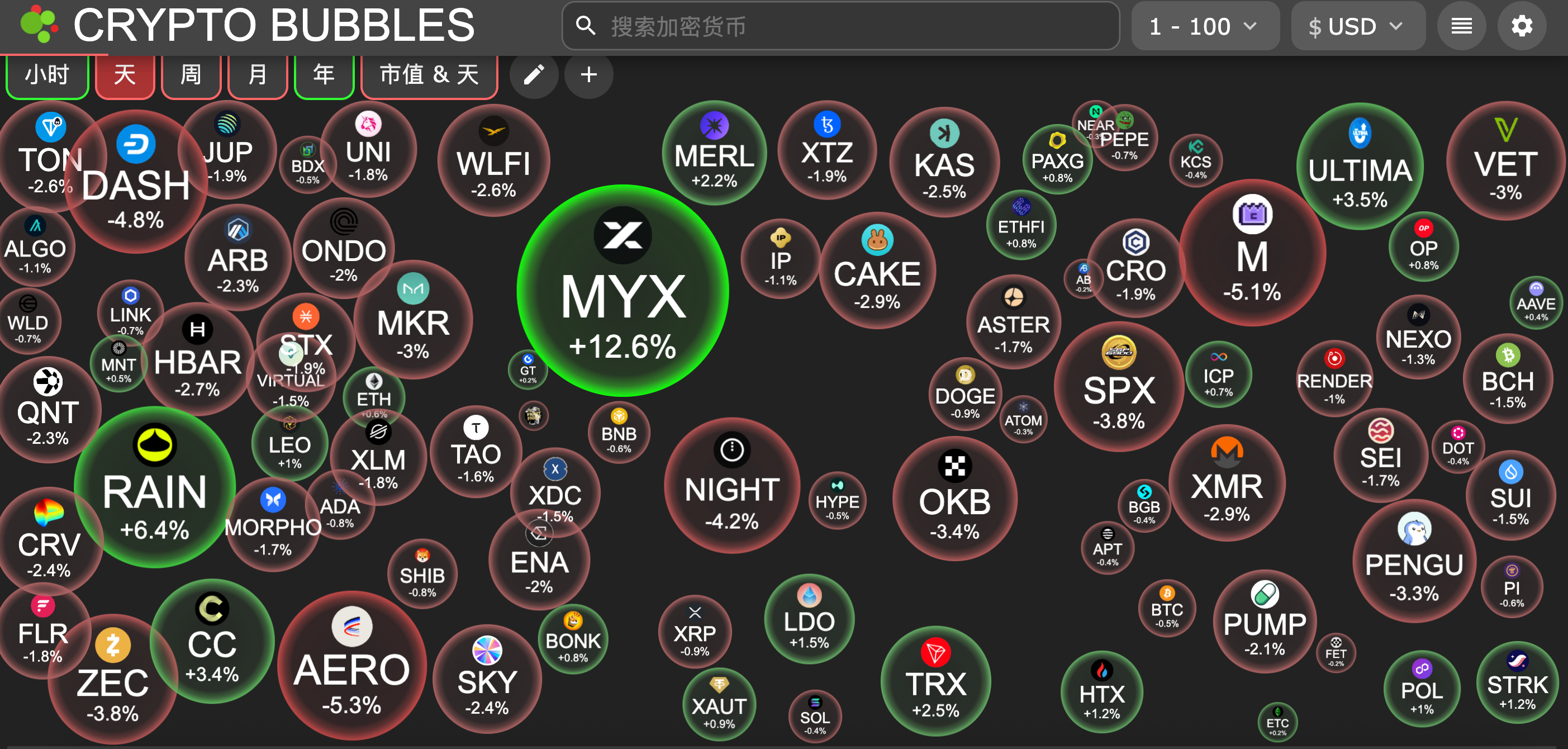 今日市值前100币种最大涨幅:MYX Finance涨12.6%、Rain涨6.4%、Ultima涨3.5%、Canton Network涨3.4%、TRON涨2.5%。