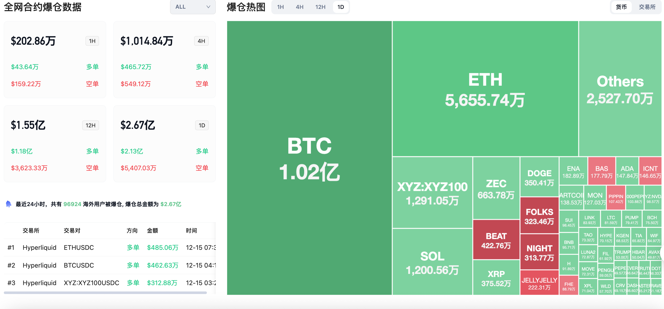 24小时爆仓数据:全球共96924人被爆仓 ,爆仓总金额为2.67亿美元,其BTC爆仓1.02亿美元、ETH爆仓5655万美元、SOL爆仓1200万美元