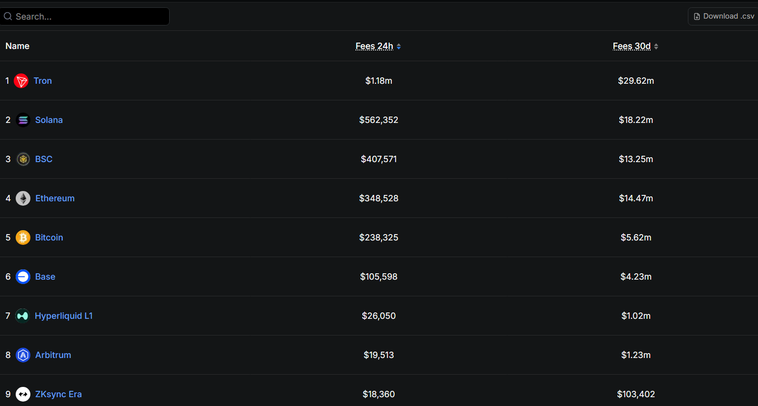本文核心数据均来源于 DeFiLlama 的 “Fees / Revenue by Chain” 面板(抓取时间:2025年12月16日)。其所定义的 “Fees” 指用户在链上支付的总费用(top-line),是衡量链上经济活动规模的近似指标,而非协议净留存收入(Protocol Revenue)。本文旨在以此公开、统一的标准,审视各公链的链上价值捕获能力。