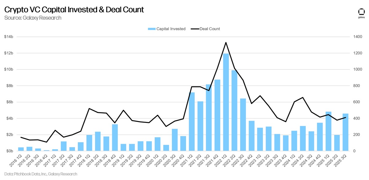 Pantera Capital在近期视频揭露了一个积极趋势。据其披露,虽然今年加密领域总融资额达到340亿美元,超过2021年和2022年纪录,但交易数量却下降了近50%。这种现象背后有几大主要原因:首先,投资者结构发生变化。在2021至2022年期间活跃的家族办公室和个人投资者,在经历熊市亏损后变得更加谨慎,部分甚至选择退出市场;其次,存量VC的投资策略趋于集中,这部分风投更倾向于将资金投入少数高质量项目,而不是像以前那样广撒网,原因在于如今启动新项目所需的资金、时间和资源成本更高;另一方面,部分资金转向相对更安全的资产,这也解释了为何本轮周期中,大量资金高度集中在比特币和少数主线资产上;再次,资金充裕但投放节奏放缓。许多风投基金在2021年和2022年筹集了大量资金,目前手里握着充足“弹药”,主要用于支持现有投资组合,并不急着投资新项目。从更长远的角度看,这种变化并非负面信号,反而是市场走向成熟的标志。