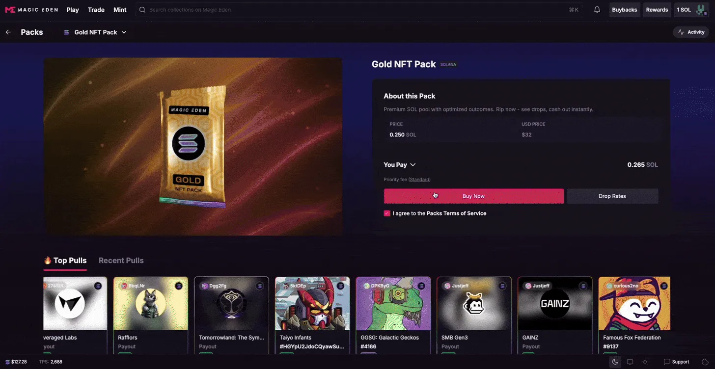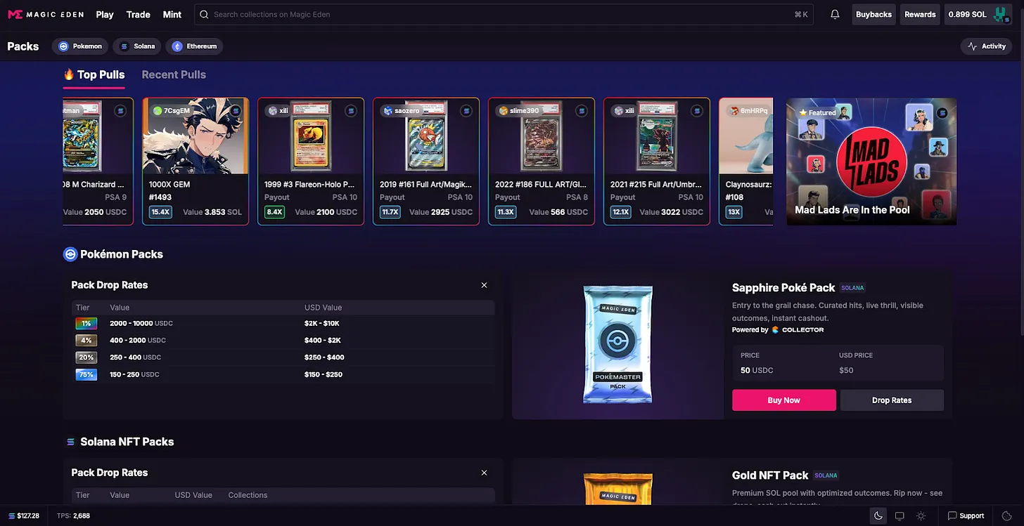 Magic Eden现在正加倍投入这款产品:增加多包开包功能,扩展数字收藏品类别,以及更多新颖的游戏机制,如卡包对战、赠送和更丰富的游戏效果。