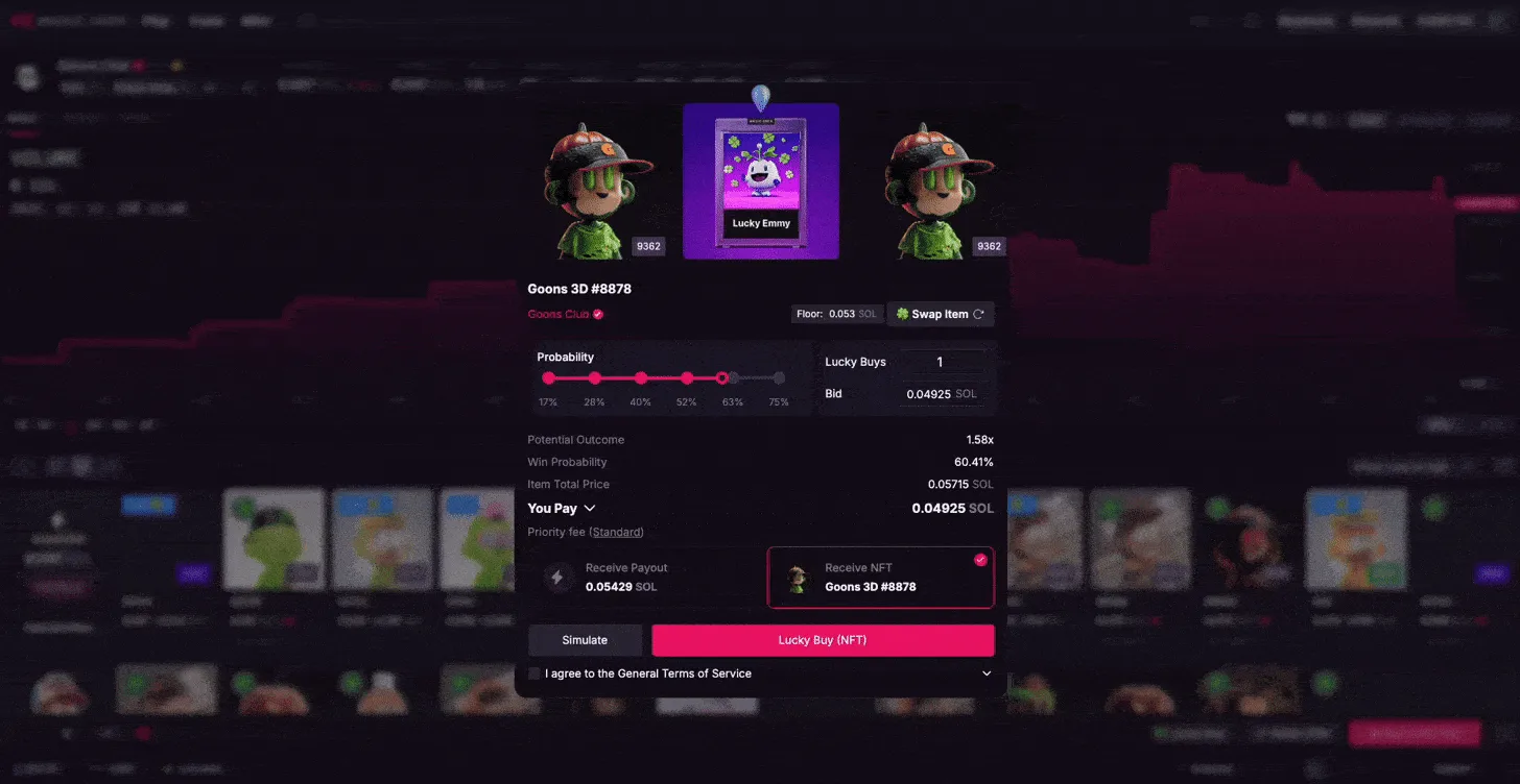 这种策略的最佳案例是“Lucky Buy”。该产品于 2023 年 9 月推出。用户可以通过轮盘赌的方式,以较小的投入尝试赢得高价值的 NFT,而无需支付全价。