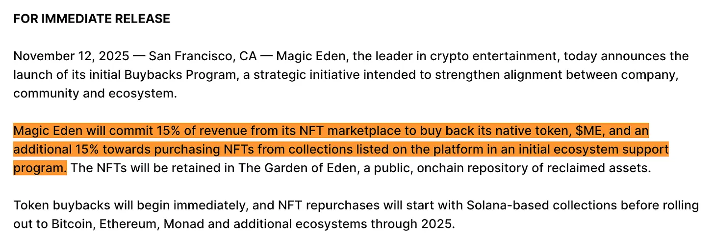 Magic Eden于2025年11月13日宣布了一项“回购计划”,以解决这一问题。该计划的理念很简单:公司将利润再投资,以支持生态系统价值。Magic Eden承诺通过以下结构返还NFT市场收入的30%: