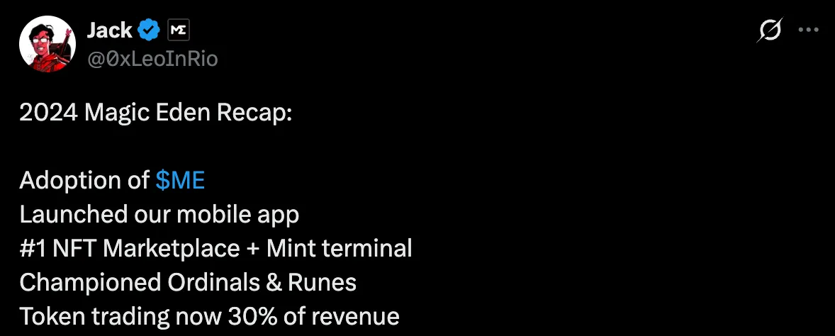 联合创始人Jack在X上表示,截至2024年,代币交易收入已占总收入的30%以上。这标志着公司与过去完全依赖NFT交易费的模式发生了显著转变。随着Magic Eden在2025年增加游戏功能,发展成为一个娱乐平台,这一转变还将持续下去。