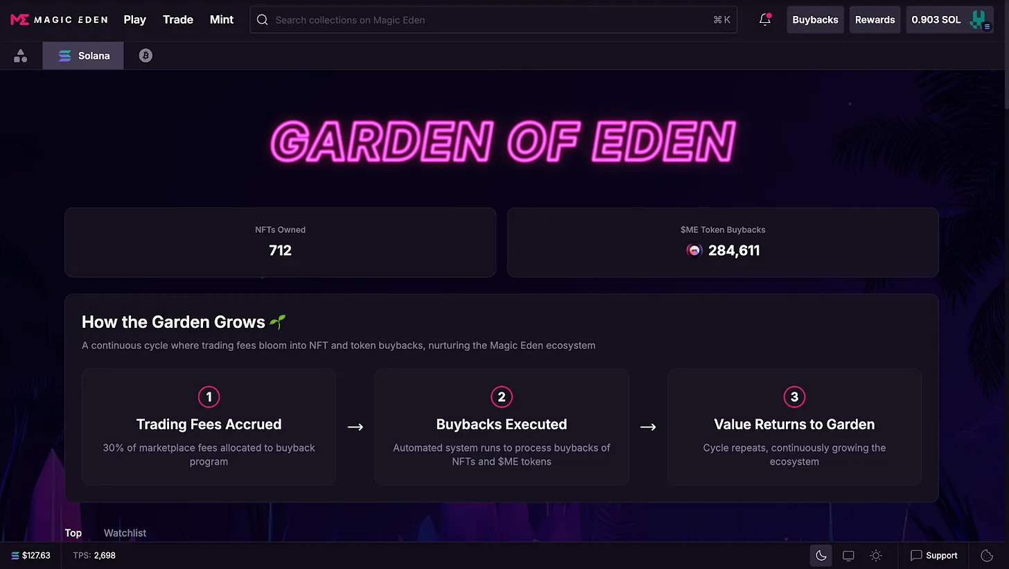 Magic Eden首先构建了稳固的财务基础。其钱包和兑换工具能够连接分散的区块链上的资产。随后,它添加了“Lucky Buy”和“Packs”等功能,以吸引大量用户。为了维持这种势头,公司推出了一项利用 30% 收入进行回购的计划,为用户提供明确的经济回报。