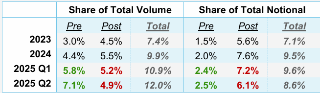 纽交所的数据显示,2025 年二季度非交易时段交易量超过 20 亿股,成交额达 620 亿美元,占该季度美国股票交易的 11.5%,创历史新高。同时,诸如 Blue Ocean、OTC Moon 等夜间交易平台的成交额也持续攀升,夜盘交易早已不再是边缘现象,成了主流资金无法忽视的新战场。