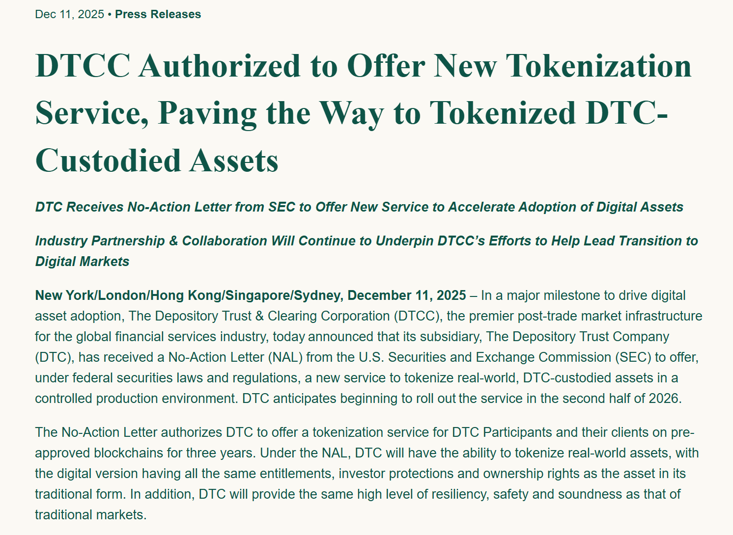 2. DTCC 固基: 12 月 12 日,DTCC 子公司存托信托公司(DTC)获美 SEC 无异议函,批准其在受控生产环境中提供现实世界资产代币化服务,并计划于 2026 年下半年正式推出,解决最核心的清算与托管合规问题;