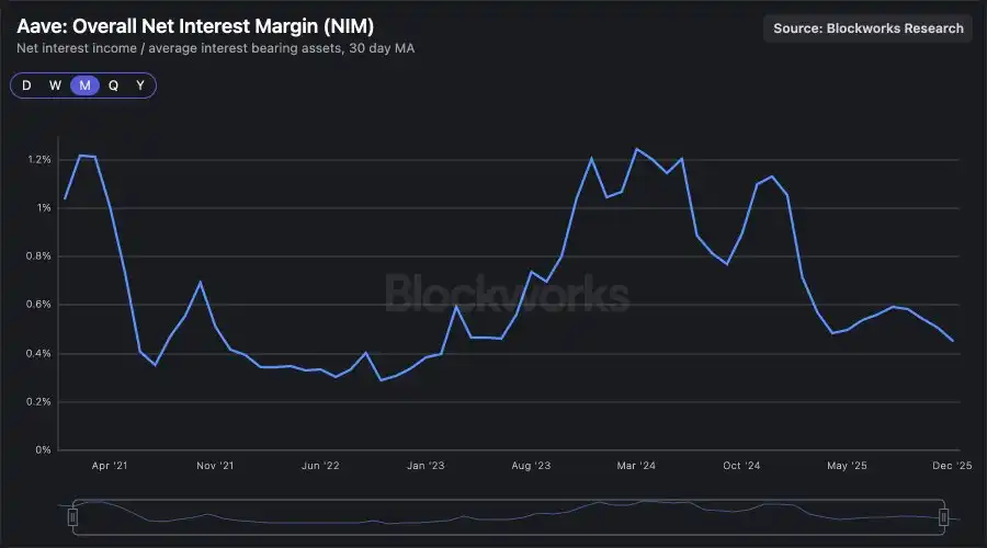 这些头寸大致等比例支持 ETH 与稳定币借贷。以当前约 0.4% 的净利差(NIM)计算,对应的借贷收益约 1700 万美元,已经明显高于 Lido 的直接收益(而且这是历史偏低的 NIM 水平)。