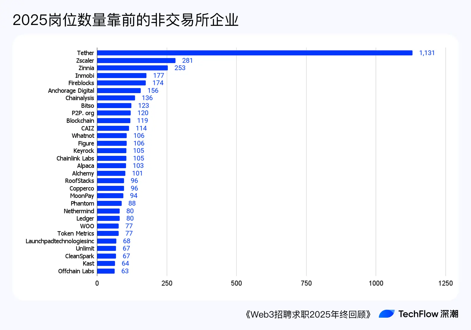 非交易所公司中, Tether 以全年 1,000+ 的 HC 展现了强劲的利润和韧性;但其他类型的企业则显然不如交易所,且高发布量的企业也主要集中在安全、资金托管等已经较为成熟的商业模式中。