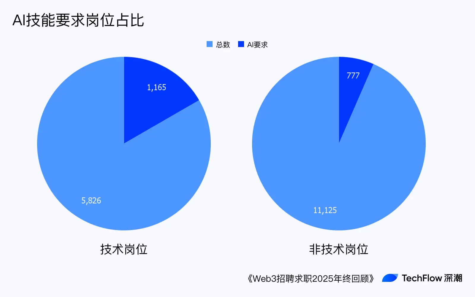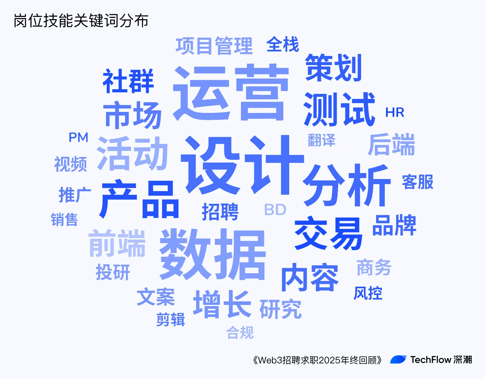 AI 数据需求与区块链开发需求遥遥领先,随后是后端、Infra 开发、运维、安全等与去中心化网络存续息息相关的岗位,之后是前端、全栈、QA、移动等,由底层逐渐向用户侧过渡。