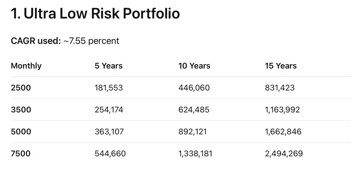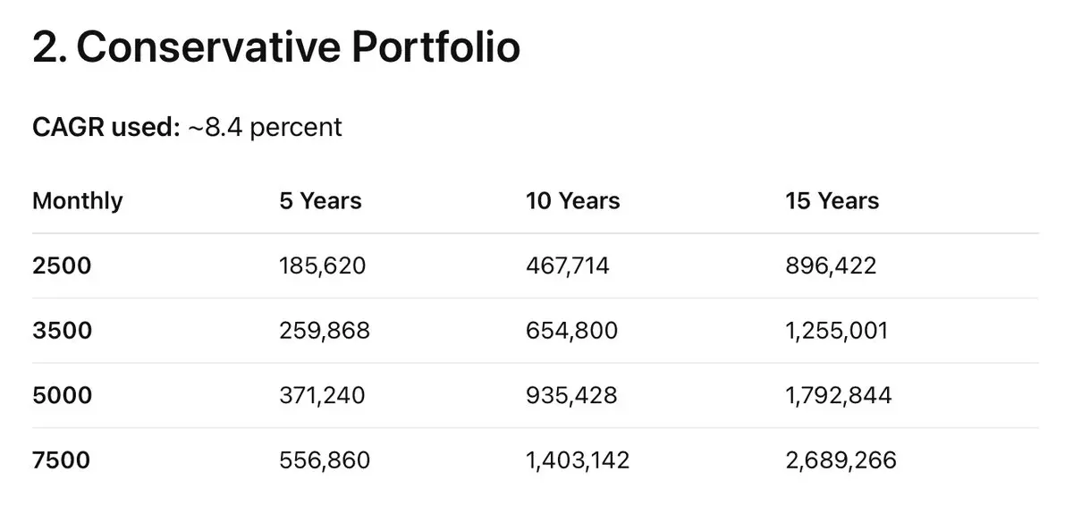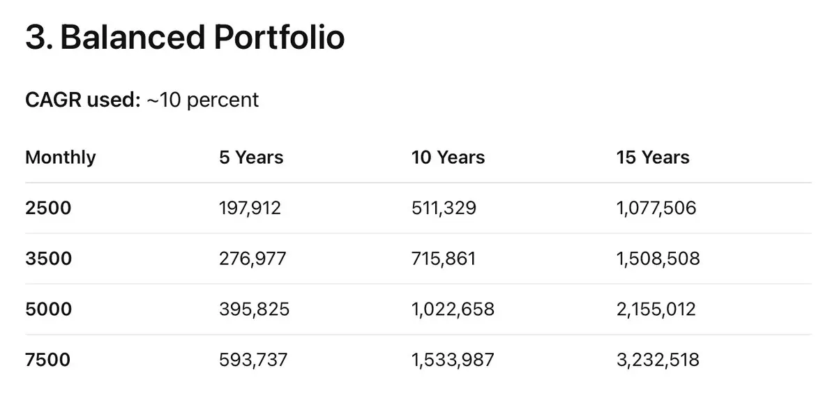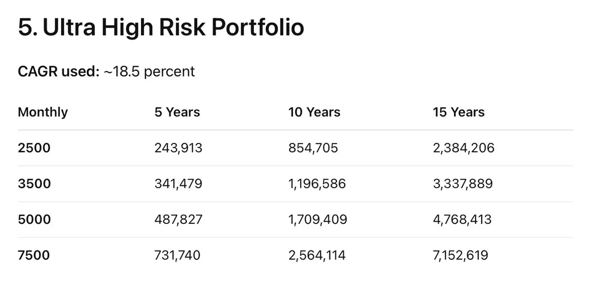 模拟推演: 如果按“获取注意力→建立社区→成功变现”的流程推进,可能需要长达2年;成功后,应当能做到每月至少2500美元的“可投资收入”(不用于日常生活)。基于上述各投资组合的CAGR,在5年、10年和15年后的预期回报将是可观的。