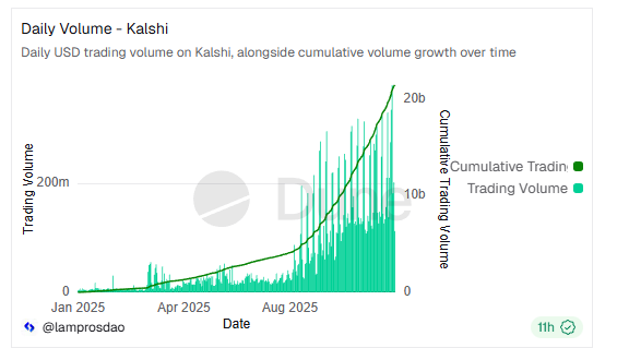从实际的发展情况来看,预测市场的确是2025年为数不多的“牛市”赛道(与稳定币类似)。在近几个月整个加密市场萎靡的状态下,以Polymarket和Kalshi为首的预测市场仍在快速的疯狂生长。