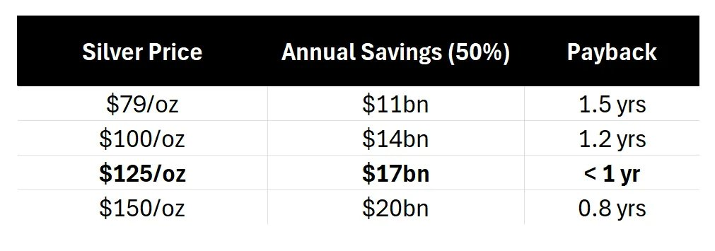 当白银价格达到 125 美元/盎司 时,铜替代的回报周期将缩短至 不到一年 ,到那时,每一次董事会会议都可能围绕铜替代展开讨论。然而,即使所有企业明天就做出决定,距离实现 50% 的铜替代仍需 4 年时间 。同时,125 美元/盎司的价格比当前现货价格仍高出 50%
