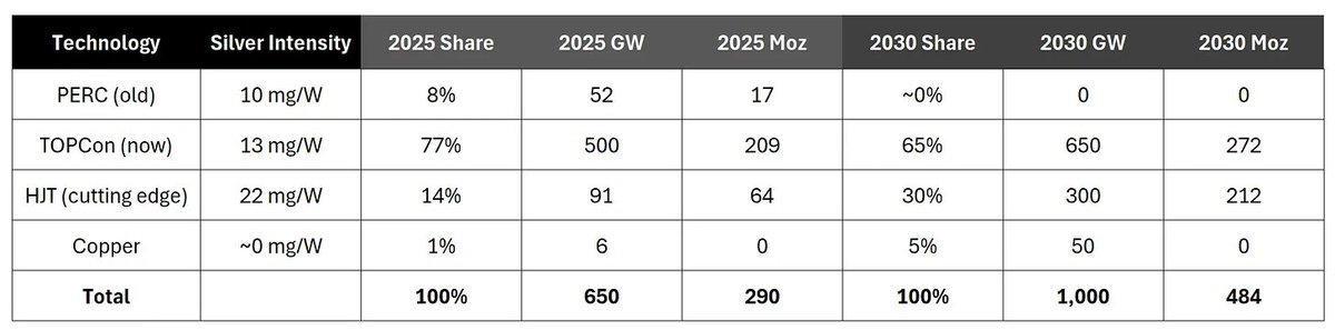 从 PERC 到 TOPCon 再到 HJT(异质结)技术的转变,实际上增加了每瓦太阳能板的白银用量,即使铜在某些方面逐步取代白银。但需要注意的是,尽管每种技术的银用量效率会随着时间提高,但 没有大规模的铜投资计划,行业整体上正朝着每瓦使用更多白银的方向发展 ,而不是更少。