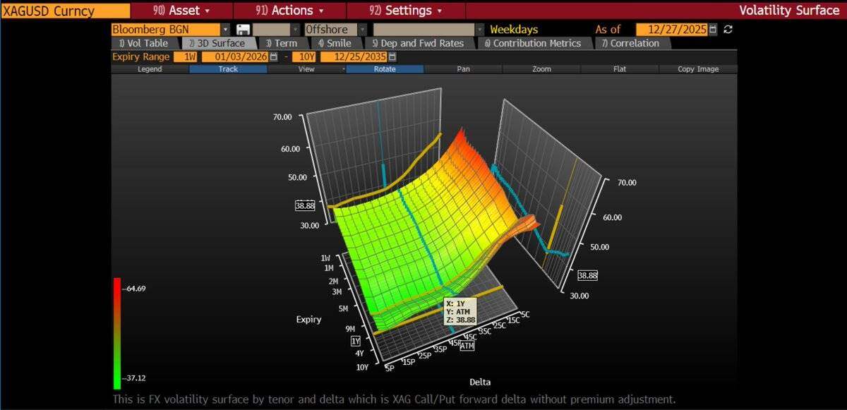 平值期权的隐含波动率(ATM Volatility)同比从 27% 上升到 43% 。看涨期权的隐含波动率更为陡峭—— 价外(OTM)执行价的期权隐含波动率高达 50-70% 。这表明期权市场正在为价格大幅上涨的尾部风险定价。