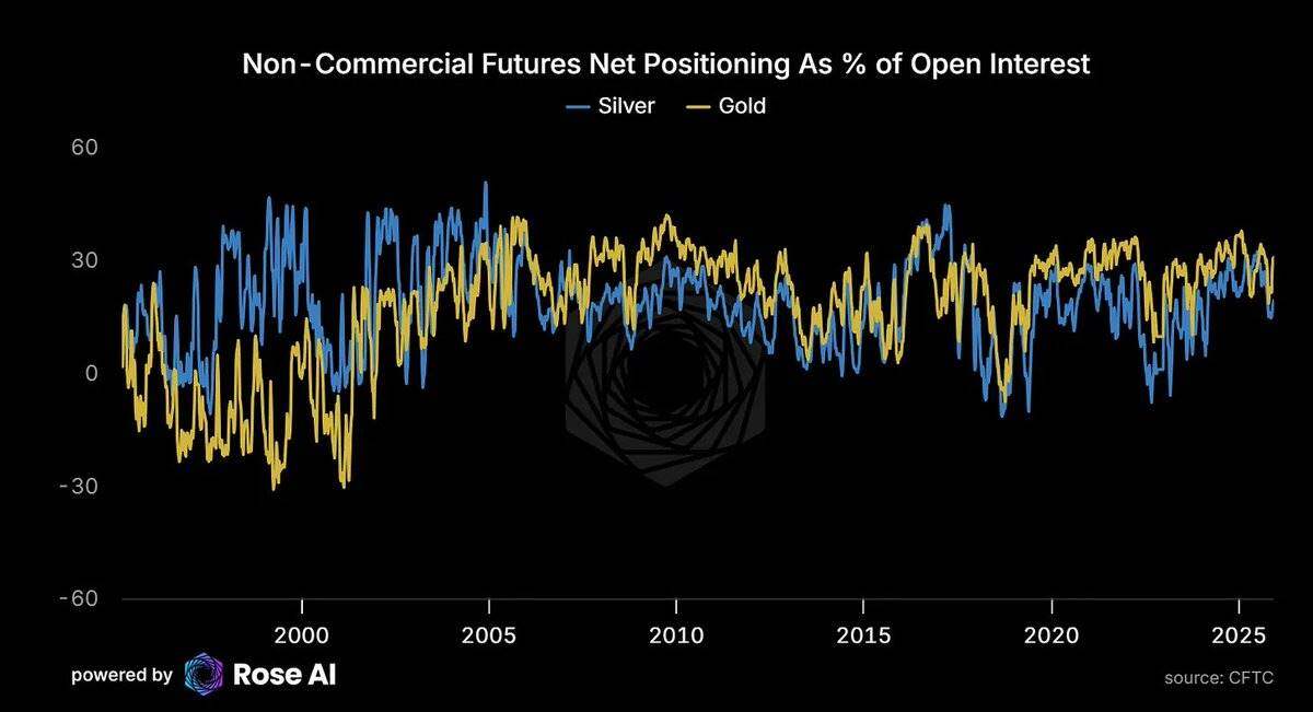 当前,黄金市场的投机净多头持仓占总未平仓合约(Open Interest)的 31% ,而白银市场的这一比例仅为 19% 。这表明,尽管白银价格已经上涨,但投机性头寸并未达到极端水平, 仍有进一步上涨的空间