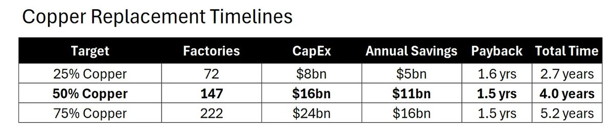 • 需要 至少 4 年 才能实现 50% 的铜替代率。