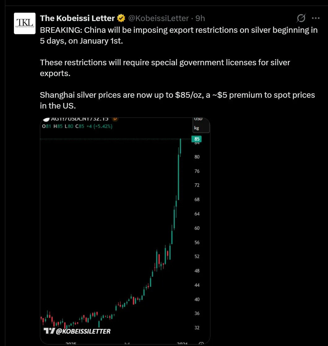 3. 中国将在 5 天内实施白银出口限制;