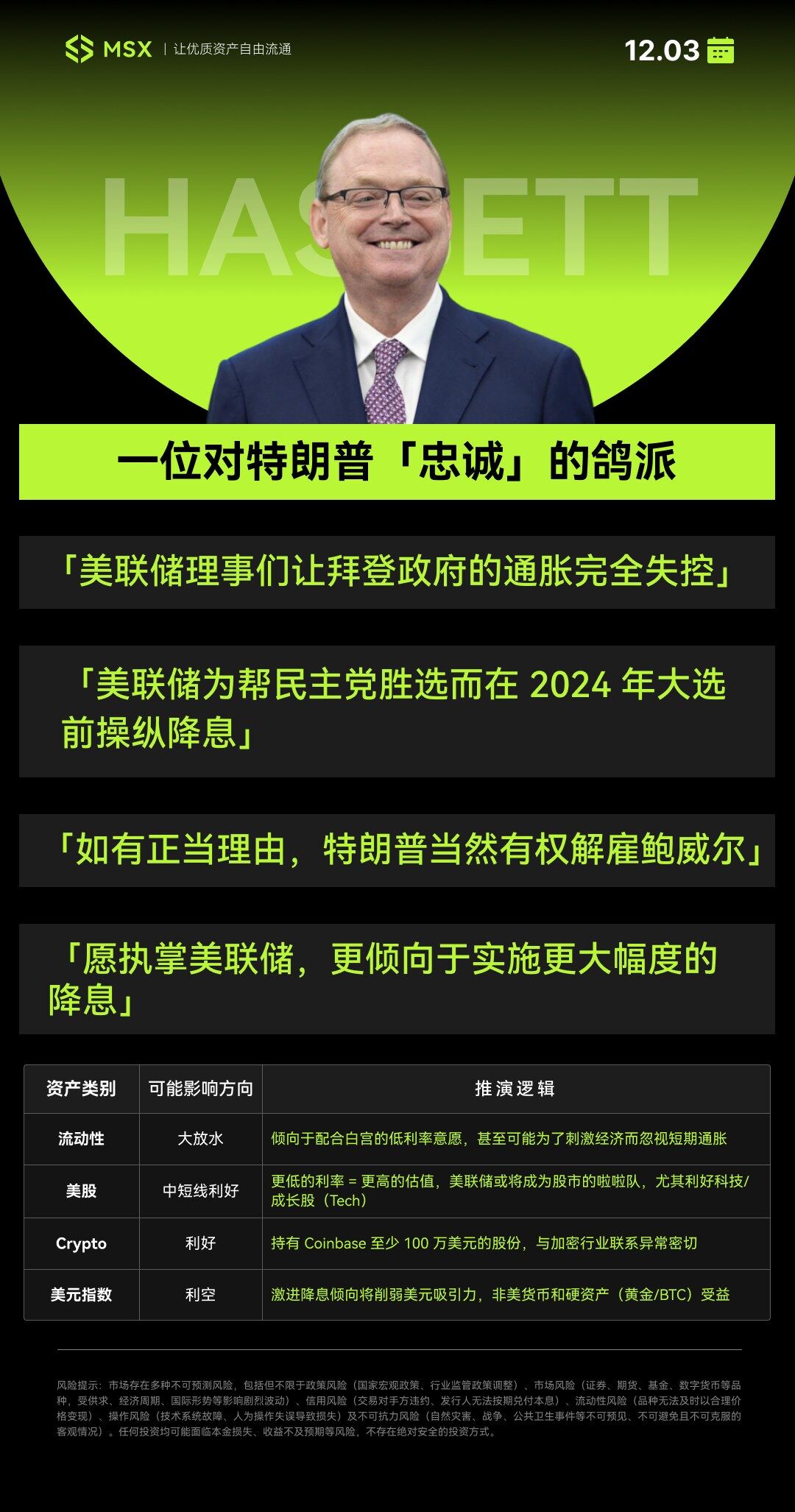 如果最终浮出水面的,是以凯文·哈塞特为代表的「忠诚鸽派」,那么跟随白宫指挥棒的美联储,极可能短期内释放更激进的流动性信号,纳指与比特币或将迎来一场情绪主导的狂欢,但其代价,也可能是通胀预期的再度失控,以及美元信用的进一步侵蚀(延伸阅读《 美联储新主前瞻:哈塞特、Coinbase 持仓与特朗普的「忠诚鸽派」 》)。