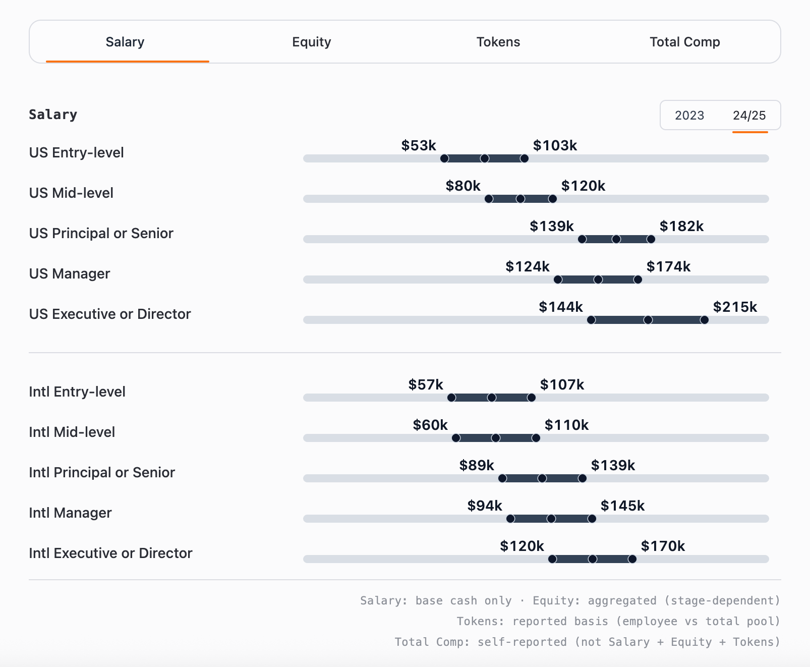 总的来说, 几乎所有职级的薪资与代币授予均有所下降 。美国岗位在现金薪酬上依然领先,而国际团队则通过更高比例的股权与代币配置缩小了差距。