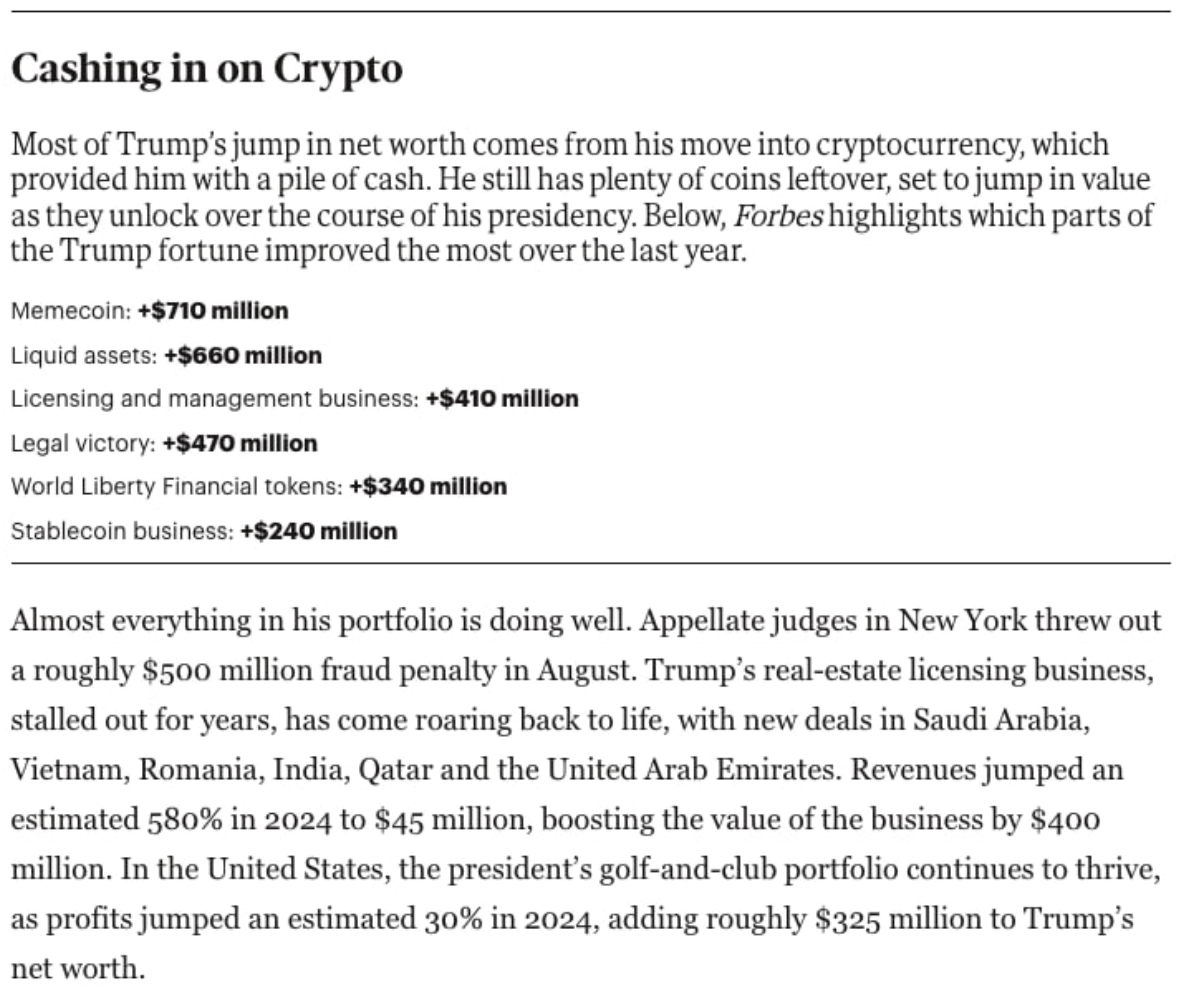 Odaily注:Forbes 报道,总统任期使得特朗普的净资产在一年内增加了 30 亿美元。
