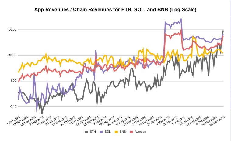 Odaily注:ETH、SOL 与 BNB 的应用收入 / 链层收入对比。