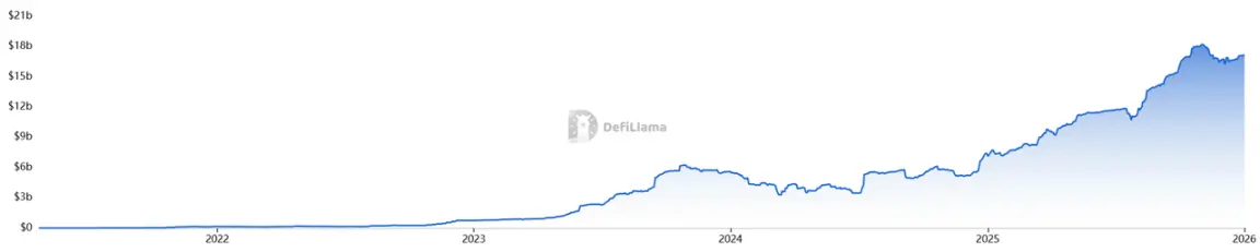 DefiLlama 最新数据显示,目前 DeFi 总 TVL 已升至 1179 亿美元,仍处于历史高位。其中,RWA 总价值已经达到 171.31 亿美元,自 2025 年以来迎来爆发性增长。