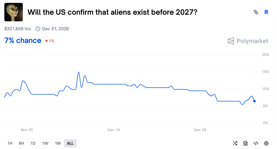 - 事件合约链接: https://polymarket.com/event/will-the-us-confirm-that-aliens-exist-before-2027?tid=1767610632144