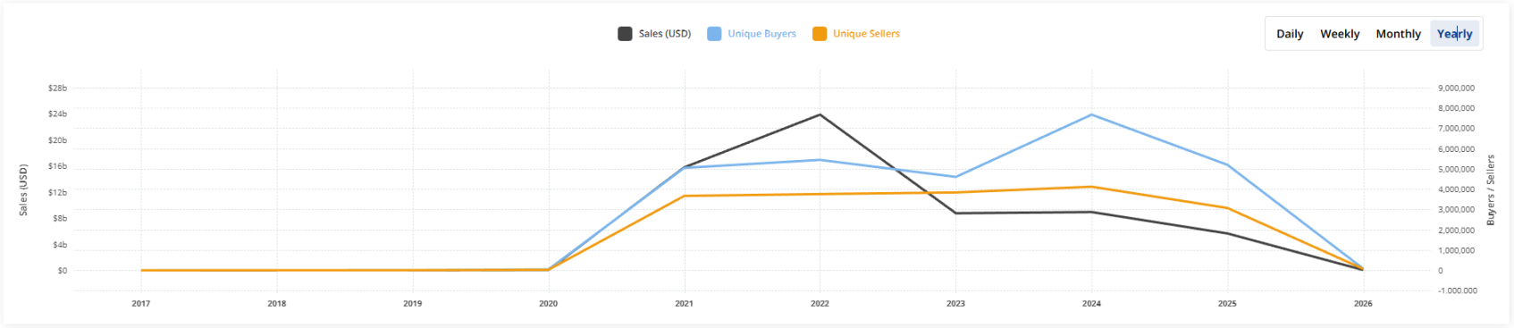 销售萎缩。据 CryptoSlam 数据显示,2025 年 NFT 销售总额约为 56.3 亿美元,较 2024 年的 89 亿美元下降了 37% 。据 CoinGecko 数据显示,NFT 总市值从 2022 年 4 月约 170 亿美元的峰值 ,跌至 2025 年底的约 24 亿美元,跌幅约 86%。仅 2025 年一年,NFT 总市值就从 1 月的约 92 亿美元 缩减至年底的规模,年内跌幅高达 68% 。