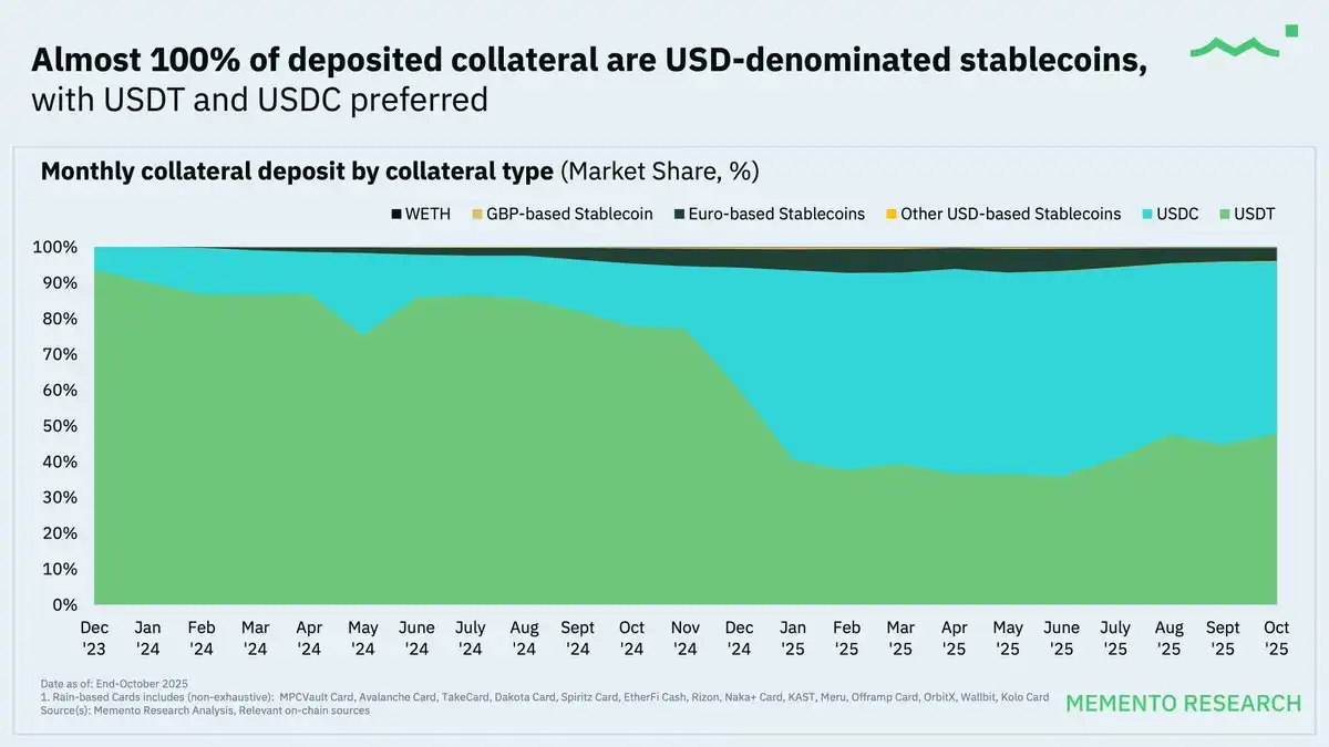 - 存款主导消费 :稳定币在存款行为中占据主导地位,占据了几乎所有的抵押资产份额,进一步强化了类似借记卡的低波动性消费模式。