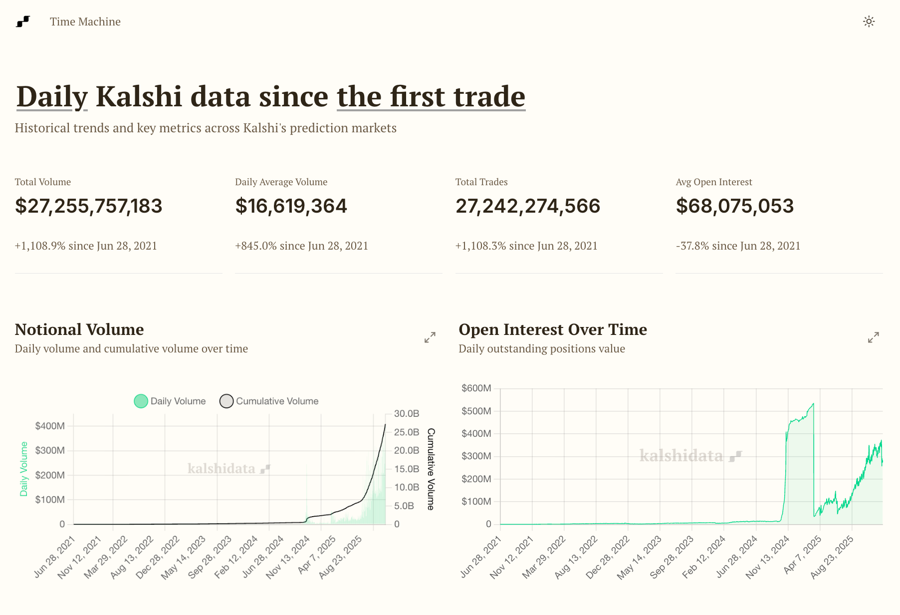 • Kalshi,平台历史交易量约为 271 亿美元;